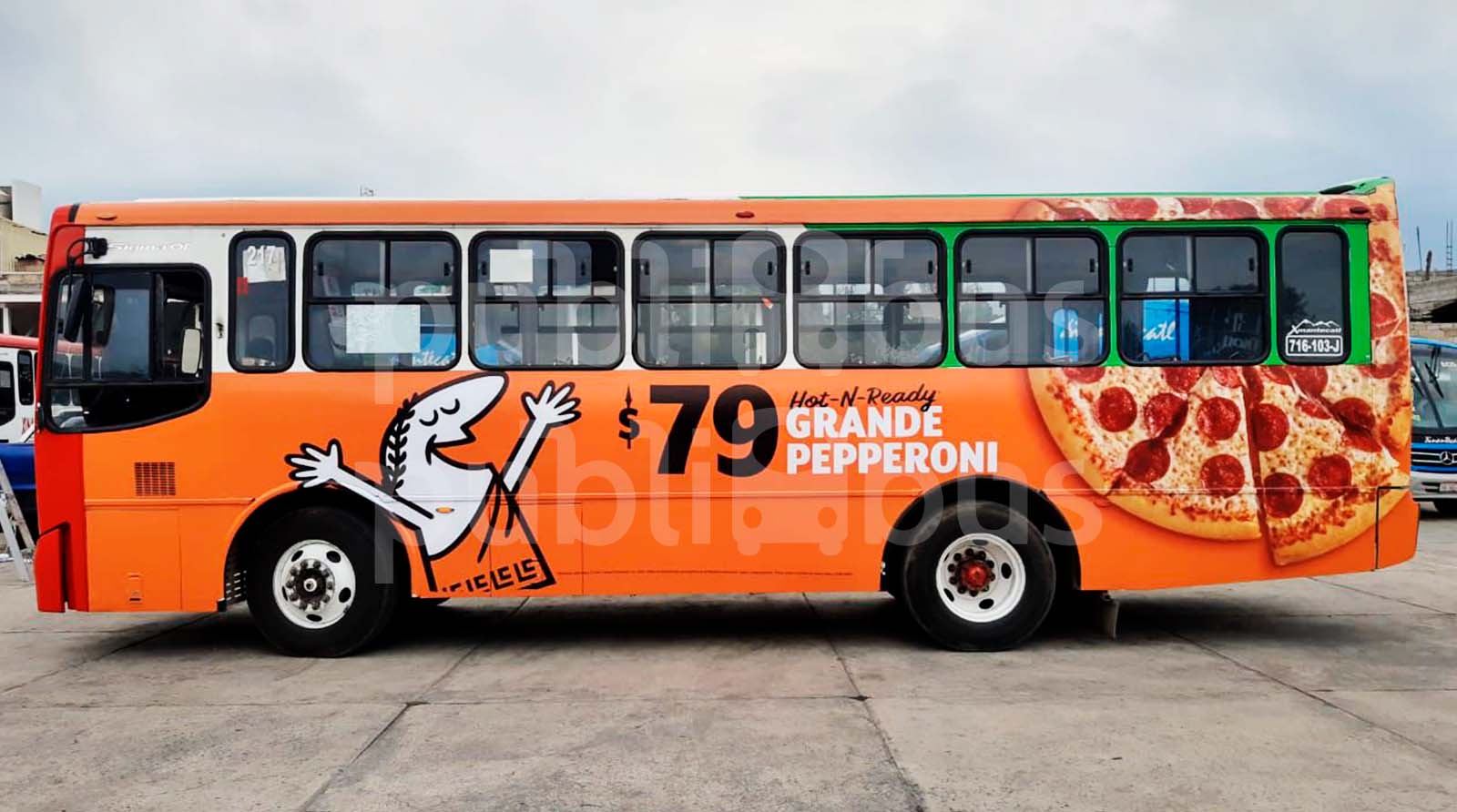 El lateral izquierdo del camión ofrece una superficie amplia y visible para quienes circulan en la misma dirección o esperan en banquetas y paraderos. Su anuncio se convierte en un mural en movimiento que recorre avenidas y calles principales, maximizando la exposición de su marca a peatones, conductores y pasajeros.